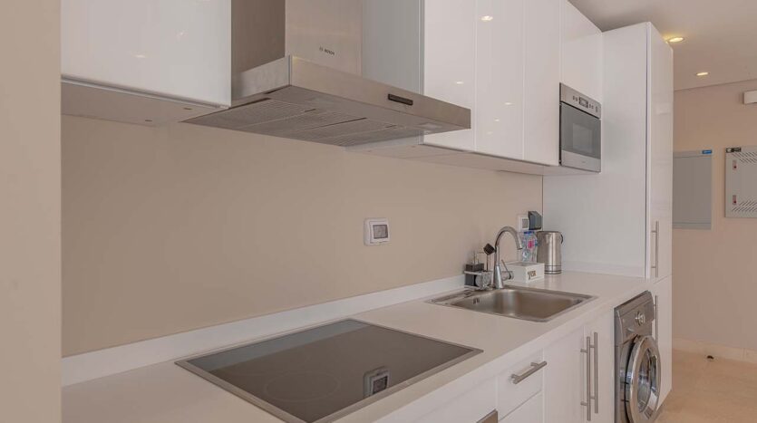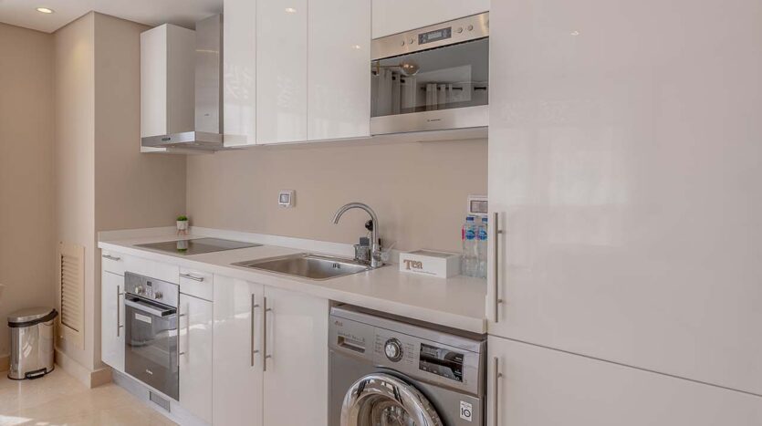 A fully equipped modern kitchen with cooker, spacious fridge, kettle and all kitchenware provided.